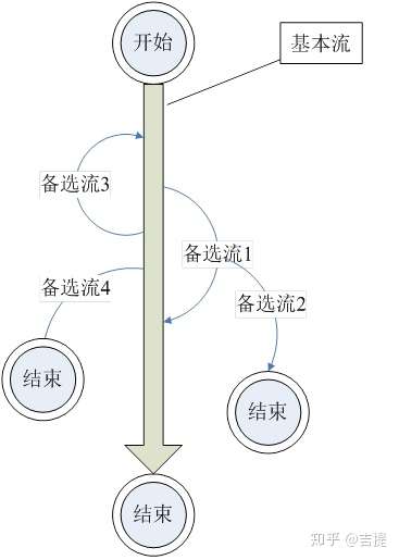 - 备选流的终点,可以是一个流程的出口,也可以是回到基本流,还可以是汇入其它的备选流;